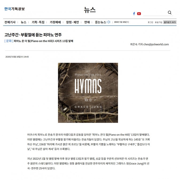 [기사] 고난주간·부활절에 듣는 피아노 연주 피아노 온 더 힐(Piano on the Hill)l 시리즈 13집 발매(한국기독공보)